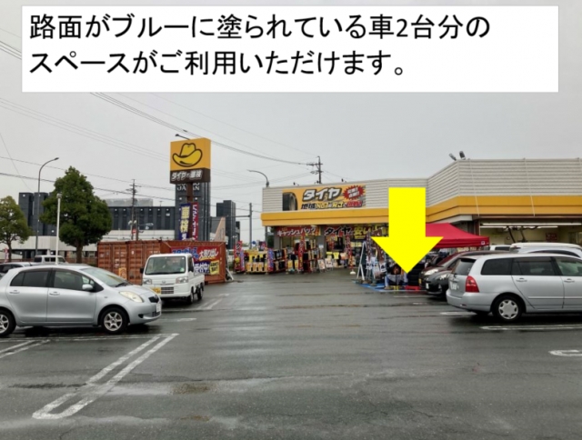 • 赤いテントがある付近がご利用可能スペースです。路面がブルーに塗られている車2台分のスペースがご利用いただけます。