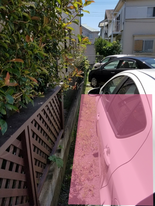 • 手前の白い車のスペースの奥になります。手前スペースはバイク駐車中です。